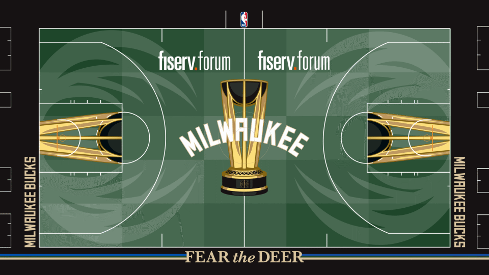 隐藏细节:在密尔沃基雄鹿队和洛杉矶湖人队主场的球场中场区域,奖杯底座图案上刻有两队各自夺得NBA杯的年份。