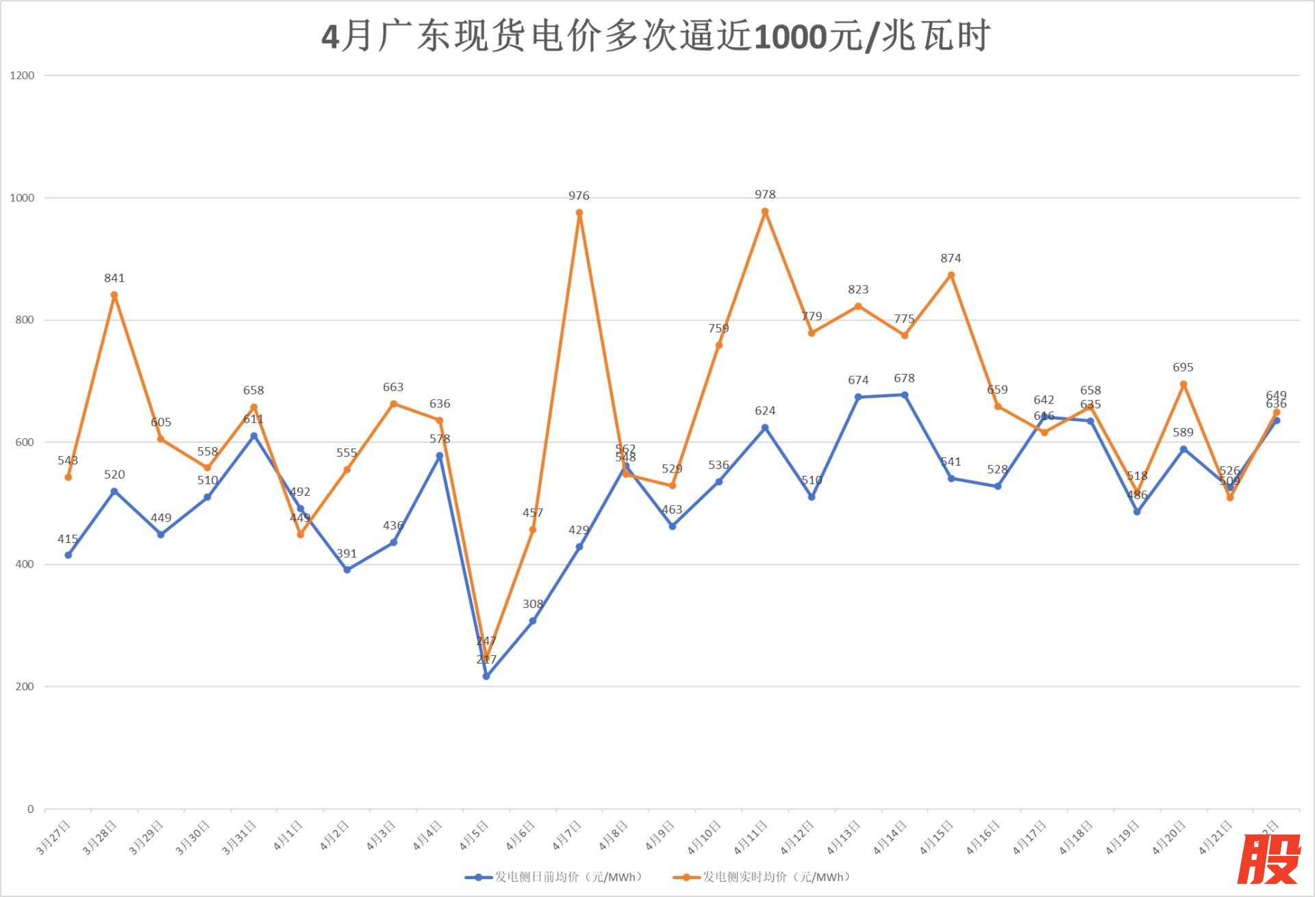 《每日经济新闻》记者(以下简称每经记者)梳理数据时进一步发现,广东现货均价短期内飙升最为突出——自3月27日至今,发电侧实时均价从最低247元/兆瓦时飙升至最高978元/兆瓦时;日前均价从最低217元/兆瓦时涨到最高678元/兆瓦时。